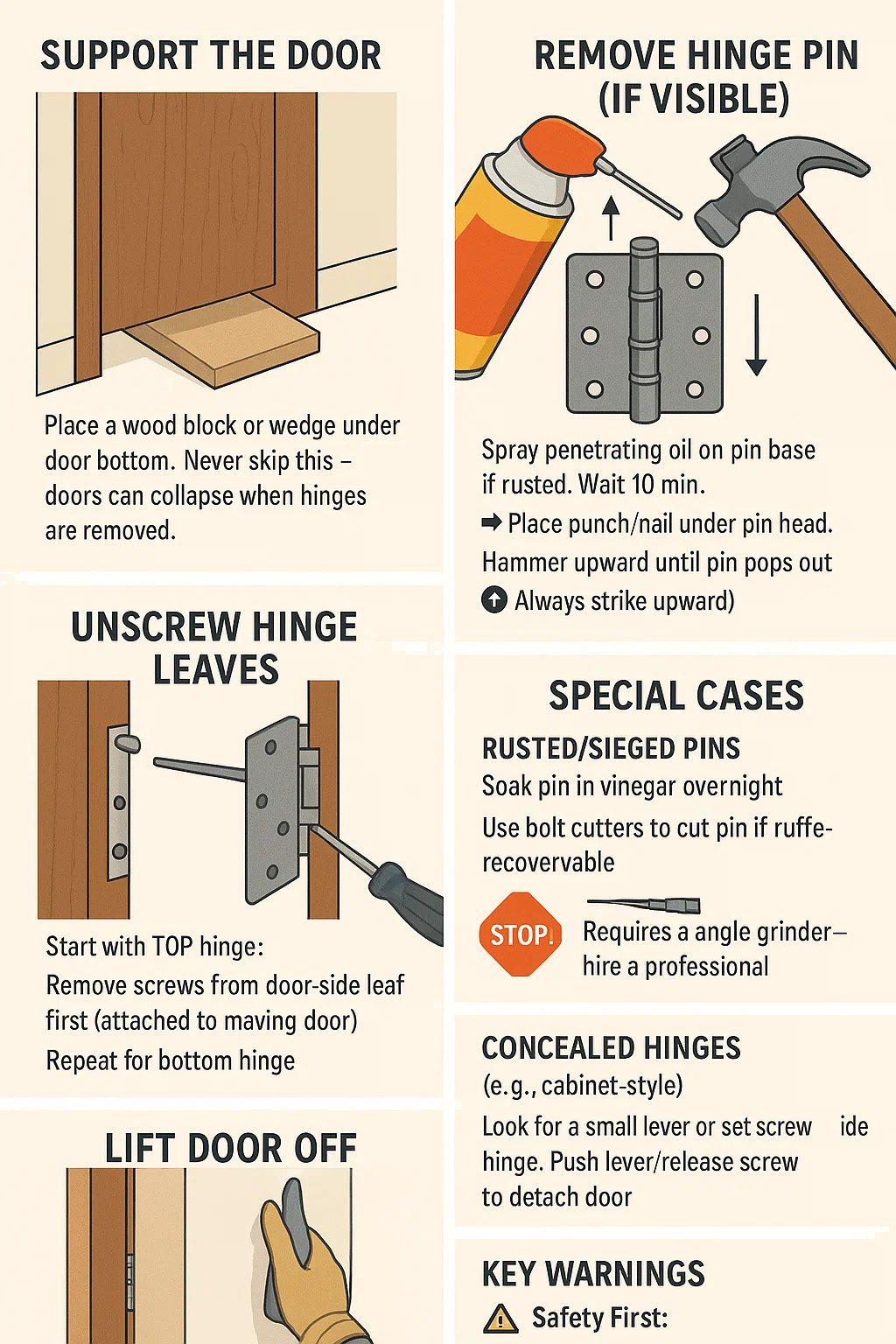 Hier ist eine Schritt-für-Schritt-Anleitung zum Entfernen von a Türscharnier sich auf praktische Methoden und Sicherheit konzentrieren: